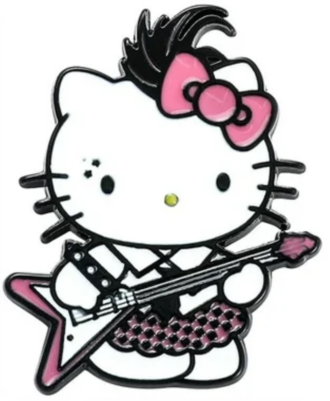 Hello Kitty rockera Pin decorativo que muestra a Hello Kitty en una versión rockera, diseñado con detalles atrevidos y originales.