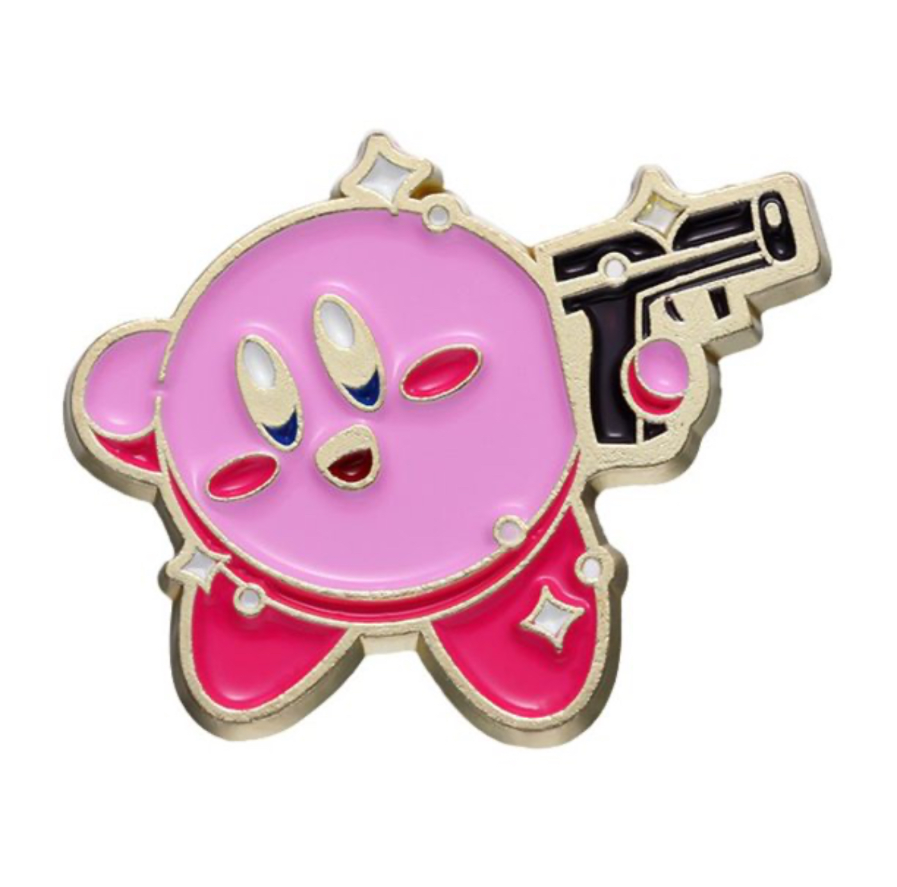 Kirby pistola chapetes Pin decorativo con Kirby sosteniendo una pistola, diseñado en un estilo cómico y colorido con detalles en sus chapetes.