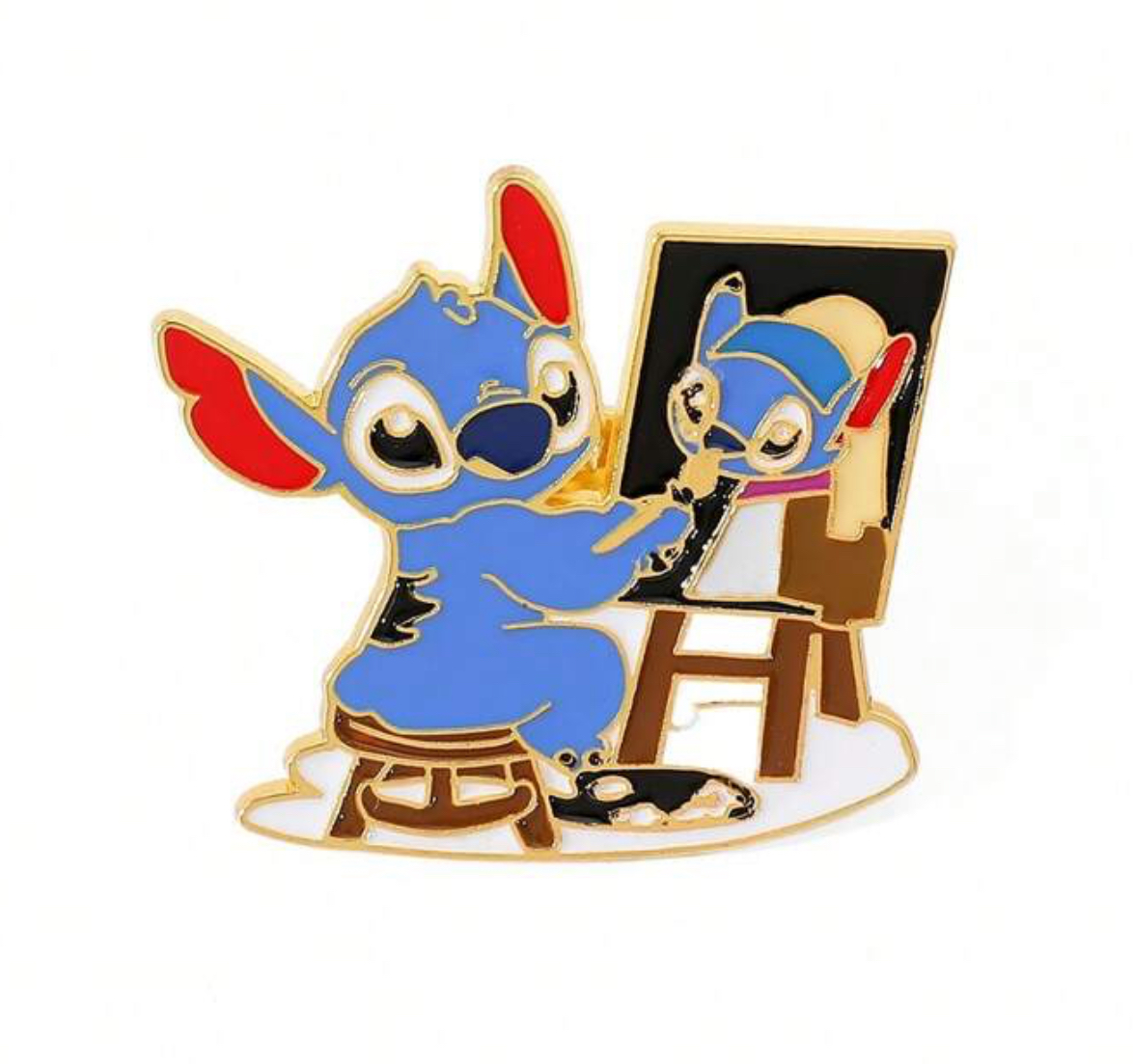 Stitch pintor “La mujer de la perla” Pin creativo que representa a Stitch pintando la obra “La mujer de la perla”, diseñado en un estilo artístico y único.